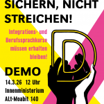 Bei der Vollversammlung der VHS-Dozent:innen am 21.2. hat sich eine Gruppe gebildet, die eine Demo zum Erhalt der Integrationskurse und der Berufssprachkurse am 14.3.26 um 12 Uhr vor dem Bundesministerium des Inneren, Alt-Moabit 140 organisiert.